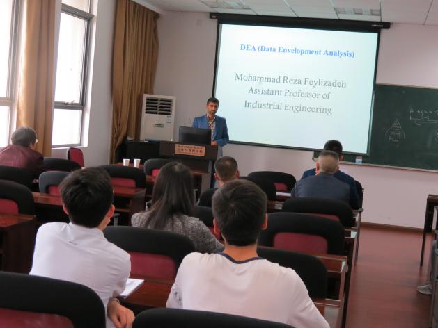 Reza Feylizadeh博士做了题为“Data Envelopment Analysis”的报告,从相对比较、多输入输出、效率测定、避免输入输出间的明显误差、成本分析等五个方面讲述了数据包络分析(DEA)的发展现状,并结合具体案例阐述了BCC模型和CCR模型在评价技术经济有效性方面的应用。根据数据包络分析目前的研究进展,剖析了模糊系统、粗糙集和灰色系统等不确定性理论在应用到数据包络分析时的学科交叉点和融合特性。报告概念新颖,充满激情,给在场的老师和同学们很多启发,报告结束后Reza Feylizadeh博士和现场师生展开了激烈的讨论。