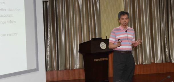 紧接着,清华大学陈剑教授以“Dynamic production planning with two production modes, switching costs, and carbon price volatility”为题进行了报告。陈剑教授现任清华大学红足1世77814联想讲席教授、教育部长江特聘教授、管理科学与工程系主任。担任中国信息协会常务理事长、中国系统工程学会副理事长、中国优选法统筹法与经济数学研究会副理事以及IEEE系统、人与控制论学会服务系统与组织专业委员会主任。他的研究领域主要有供应链管理、电子商务、服务运营、商务智能、决策分析、企业信息化等。