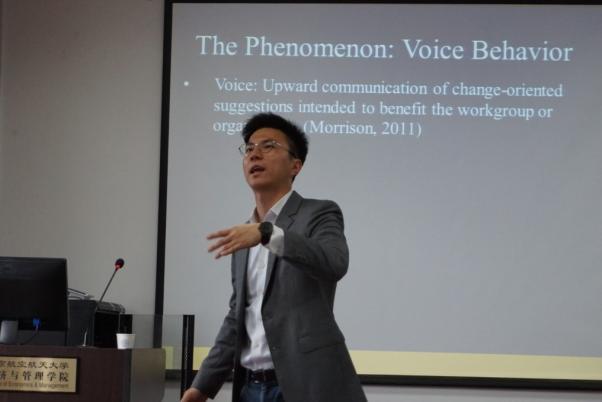 林教授的讲座分三个模块。其一,介绍了他最新的研究成果——员工向领导建言的直接程度与领导认可之间的关联。这项研究的核心观点是:员工建言的直接程度对于领导认可员工有积极影响,但是这一关系也受制于员工建言时的礼貌程度和员工本身的可信程度。这项研究挑战了“说话直接易导致领导不快”的传统看法。其二,介绍了他即将在Academy of Management Review发表的论文。这一创新成果挑战了目前主流管理学文献将建言看作一种深思熟虑的行为的看法,提出建言在很多情况下受个人习惯驱使。其三,和参与的老师、同学就国际高水平期刊投稿中的各种问题进行了交流。报告过程中,林教授所展示的创新思维给予在座师生诸多启发,使大家获益匪浅。特别值得一提的是,无论是在报告过程中还是互动模块中,在座师生都踊跃提问,积极交流。报告最后在热烈的掌声中圆满结束。