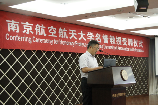 许希武副校长代表学校向Roman Slowinski院士颁发聘书并佩戴了南航校徽。Roman Slowinski院士在致辞中对学校的聘任表示十分荣幸和感谢,对这次南航成功承办首次在亚洲召开的GDN国际会议表示祝贺,并对我校近年来在科学研究、人才培养和国际合作等方面取得的成就给予了高度肯定。
