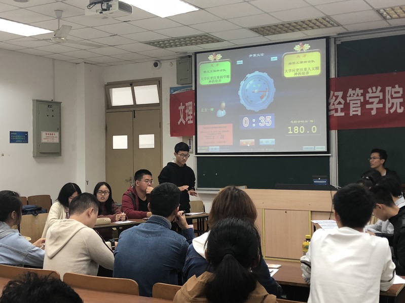 思辨会开始,两支队伍围绕“大学生应更注重人文精神的培养还是科学精神的培养”这一主题展开辩论。正方选手首先根据人文精神与科学精神的定义,指出大学教育旨在人才培养、服务社会。任何科学的探索和创新,都是为了满足于人的需要,达到让人类生活的更加幸福这一终极目的,并坚持人文精神指导下的科学探索,才具有存在的意义。反方辩手则从科学精神的实践性与人文精神的局限性两个角度进行分析,认为人文精神会受到政治、经济、文化等多种时代因素的限制和影响,此时唯有坚持科学精神的指导,本着一种求真务实的态度去探求人文精神的真正内涵,才能在纷繁芜杂的人文思潮中选择正确的方向,指引我们投身社会的建设。双方选手在“立论”、“驳立论”、“智辩”等环节中思路清晰、引经据典,使现场气氛迅速升温。