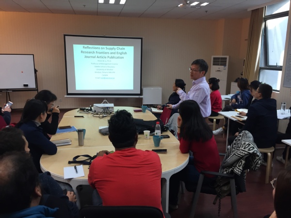 在学术交流活动中,李武教授首先介绍了供应链管理研究的前沿现状,指出将企业社会责任、环境责任以及不同的非经济偏好纳入可持续供应链管理。其次,李武教授通过自身对十余家国际SCI/SSCI期刊发表以及审稿经验的反思,就论文的写作提出了很多建议。