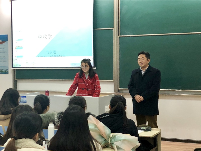 当天上午,在2017级会计学专业的《税收学》课前,周德群向同学们介绍了马永远老师的学习经历、科研经历等基本情况;作为西安交通大学、香港城市大学联合培养的博士,马永远在求学期间成绩优异,发表多篇高质量论文,科研成果丰硕,多次获得各类奖学金,2018年博士毕业后应聘至红足1世77814工商管理系任专业教师。周德群建议同学们积极向马老师请教、学习,在夯实基础学业的同时,培养科研兴趣,尝试进行学术研究。他也勉励马永远老师尽快完成从学生到教师的角色转变,潜心教学,将教授课程打造成学生喜欢的“金课”。