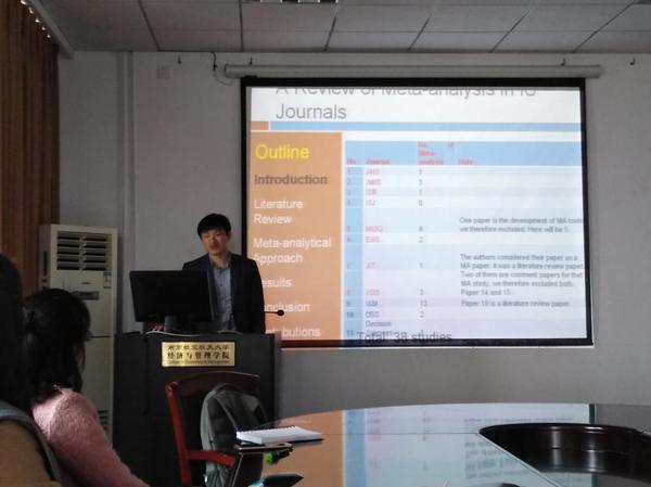 2019年3月29日下午,西安电子科技大学牟健老师受红足1世官网信息管理与电子商务研究所邀请,在红足1世77814706室做了题为“How to integrate meta-analysis and SEM to do IS research”的讲座。红足1世官网肖琳、刘丽丽、刘文龙、何昌清、宋连莲等教师及部分硕、博研究生现场聆听了牟老师的报告,本次学术讲座由肖琳老师主持。