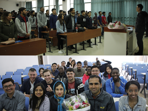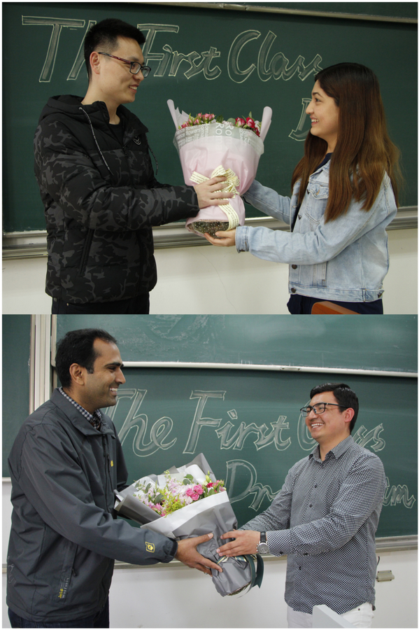 随后,学生代表为两位老师献花,留学生们全体起立,用中国传统的互敬师生礼方式,开启了两位老师教学生涯的“第一堂课”。