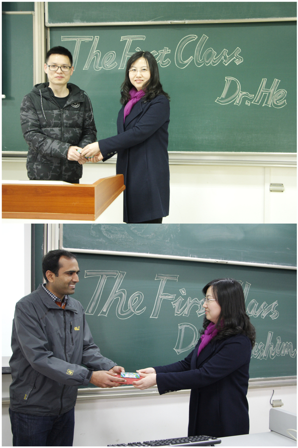来自五湖四海的近百名留学生们共同见证了这一温馨而庄重的一幕。邓晶、王英分别为留学生们简要介绍了何昌清、HASHIM的学术经历和科研成果,希望同学们在国际化的课堂中学得其乐,学有所获。焦宏图则为两位新教师送上了学院精心准备的“金嗓子喉宝”和“经管定制优盘”,希望两位老师用“金嗓”打造“金课”,用U盘记录师生从游的美好点滴。