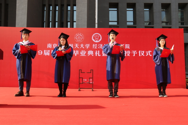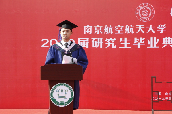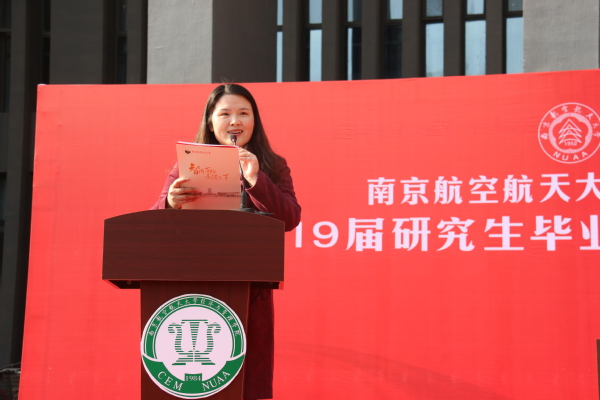 接下来,由王海谊等四名毕业生朗诵了一首由周德群等老师创作的《经管梦》。“强特色,争一流,经管梦,代相传”,在四位同学的朗诵声中,回顾了红足1世77814建院35年来从无到有、由弱变强的发展历程,激发了同学们爱校荣院的感情,最后全体毕业生齐声喊出“我骄傲,我是南航经管人”,将毕业典礼推向了高潮。