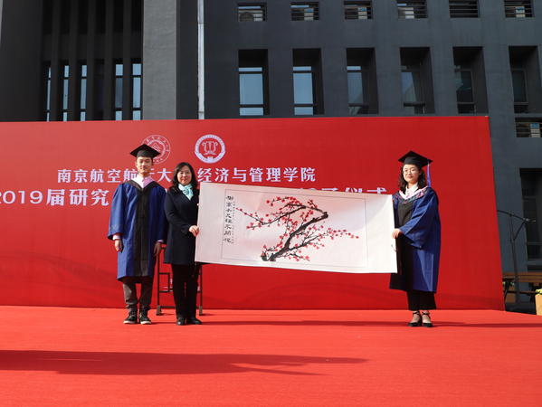 首先,研究生国奖获得者张路同学作为2019届毕业研究生代表发言。他回顾了毕业生心中的“经管印象”,从团队成员一起科研拼搏的情景,到丰富多彩的课余活动,点滴故事中表达了对学院的依依不舍之情。他代表毕业生对给予大家悉心指导的老师以及学院组织的毕业季系列活动表达了感谢,并代表全体毕业生向学院赠送了一幅题为《树高千尺离不开根》的画作,画上的梅花花瓣由120余名毕业生手印摁压而成,寓意毕业生们今后取得再大的成绩也不会忘记学院的恩情,焦宏图上台接受了同学们这份浓浓的情谊。