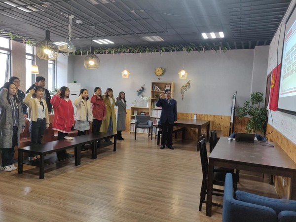 最后,站在鲜红的党旗面前,党员们佩戴上党徽,再一次举起右手,在皋德仲的领读下,所有党员同学一起重温了入党誓词,圆满的完成了最后一次党日活动。