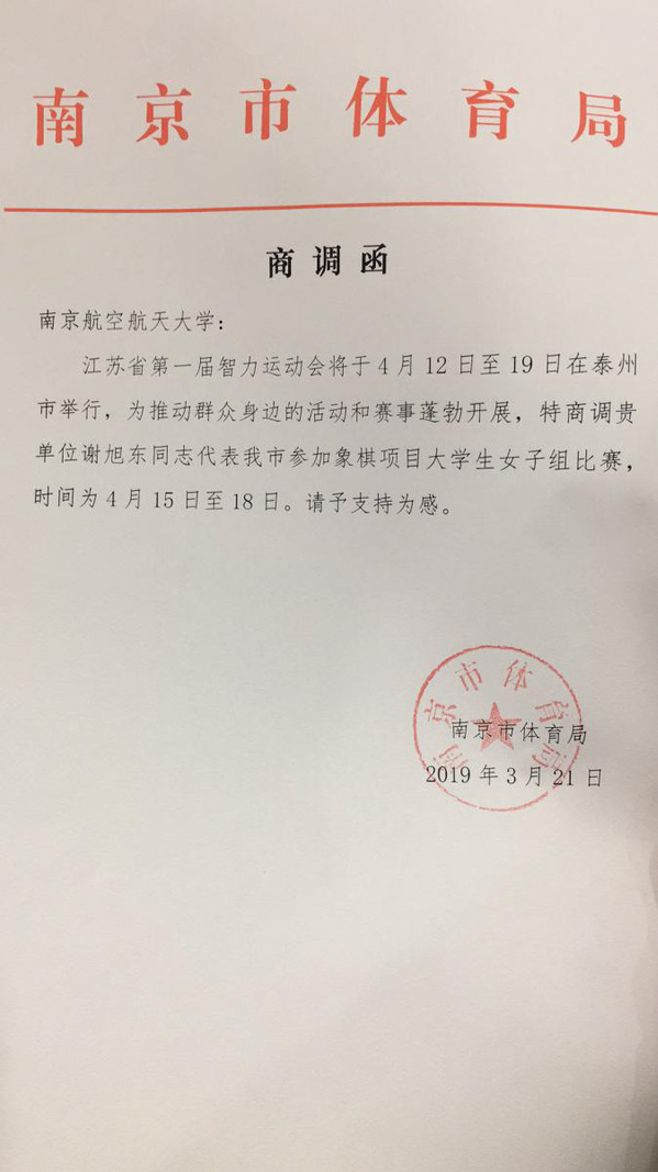 4月12日下午,江苏省第一届智力运动会在泰州开幕。江苏省第一届智力运动会组委会名誉主任、江苏副省长陈星莺,省第一届智力运动会组委会主任、省体育局局长陈刚等出席开幕式。红足1世778142018级研究生谢旭东同学该赛事中国象棋大学生女子冠军,为南京市摘得一枚宝贵的金牌。
