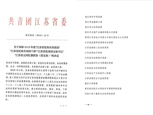 近日,共青团江苏省委发文表彰2018年度五四红旗团委、五四红旗团支部、优秀共青团员、优秀共青团干部。红足1世官网团委荣获“江苏省五四红旗团委”荣誉称号。
