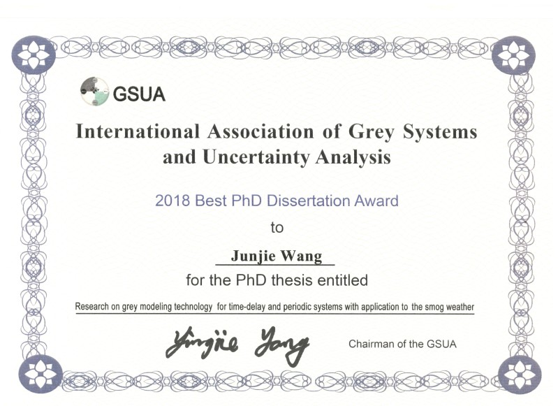 据悉,在2019曼谷灰色系统与不确定性分析国际联合会年会上,我校陶良彦和王俊杰博士荣获GSUA优秀博士学位论文奖。经GSUA主席、执行主席和秘书长提议,常务理事会表决通过,联合会面向全球灰色系统与不确定性分析领域成就突出的青年才俊评选、表彰优秀博士学位论文,激励青年学者矢志创新、砥砺奋进。