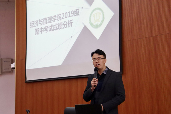 接着,康冲从成绩分布、高分比例、横纵向比较等多个角度入手,具体分析了管理科学与工程类、工商管理类、经济与贸易类各班的期中考试成绩,帮助学生合理定位当前学习状况,并就同学们入学以来在学习方式、习惯养成上的问题,提供了一些有针对性的建议。最后,他结合学院学业与发展支持中心的工作发布了学院下一阶段在学困生帮扶、集中晚自习设立等一系列的工作安排。