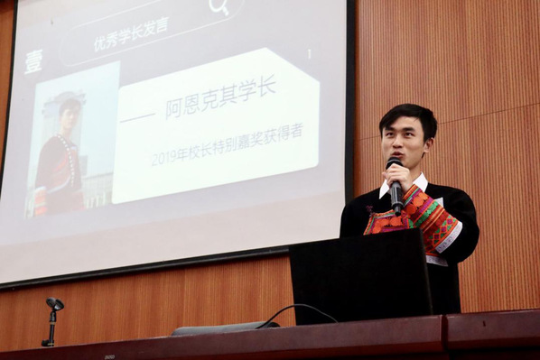 首先,为发挥高年级优秀同学的示范榜样作用,校长特别嘉奖之励志奖获得者2017级本科生阿恩克其受邀到场从“励志笃学”“适应环境”“志愿服务”三个方面分享了他的成长故事,他建议大一学弟学妹们尽快明确学习方向、充实大学生活,成为一名德智体美劳全面发展的经管学子。