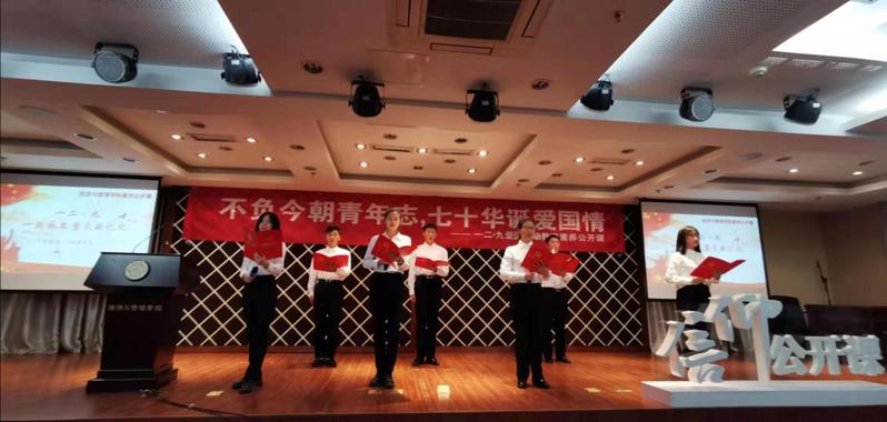 公开课伊始,董羽为在场学生讲述了一堂生动的微团课,围绕“是什么”“为什么”“怎么做”这三个问题,回顾了一二九运动发生的背景和历史意义,他引用习总书记对新时代中国青年提出的“六点要求”,指明当代青年的历史使命、肩负重任,并结合时代背景对经管学子提出了牢树青年志、永怀报国情的希望与要求。接着,学院各级学生骨干进行了形式多样的表演,讲述他们心中的爱国情。既有激情澎湃的朗诵与演讲,又有扣人心弦的歌曲合唱;既有发人深省的话剧,又有清新脱俗的竹笛演奏。激动人心的表演让在场学生经历了一次深刻的爱国主义洗礼,他们纷纷表示此次公开课让他们受益良多,大一学生向金玉表示:“很荣幸参加这次活动,让我能够更加深入地了解红色历史,作为大学生的我,会像先辈们一样,以深厚的家国情怀作为立身之本,怀抱坚定的信仰,用行动去实践新时代的爱国主义。”