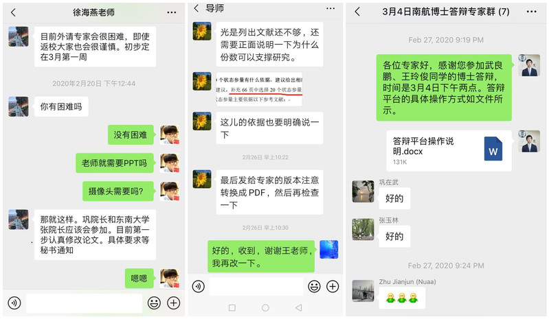 早在确定远程答辩形式后,两位博士生导师王英教授、徐海燕教授就开始联系校外专家,筹备答辩事宜,并与学生确认远程答辩设备,对答辩所需材料进行指导把关。为了保证答辩顺利进行,导师与答辩秘书制定了详细的答辩工作方案,提前排查各种突发情境下可能存在的问题,并通过反复模拟答辩过程,梳理出答辩操作说明。在对比几个平台的使用效果后,答辩秘书何沙玮老师最终选定使用zoom作为线上平台。与此同时,研究生院学位办、校信息化处以及学院也全程给予了帮助与指导,为两位学生的顺利答辩保驾护航。
