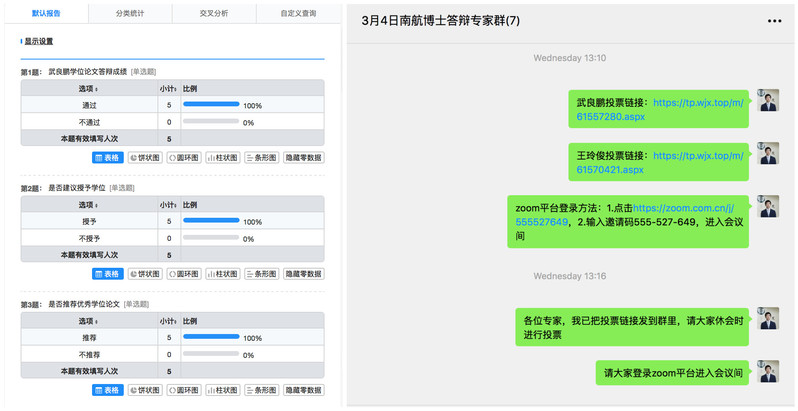 答辩过程中,按照南京航空航天大学研究生学位论文答辩要求,两位学生通过论文内容陈述展示了研究成果,对答辩委员会成员的提问质询进行一一解答。答辩完成后经过答辩委员的线上讨论、投票表决,一致认为两位博士研究生的研究成果、学位论文和答辩过程达到了博士学位的要求,建议学位委员会授予博士学位。为了确保学位论文线上答辩的公开、真实、完整、使线上答辩有据可循。整个答辩过程,以及后续的匿名表决环节都做了录屏、截屏,作为答辩记录留存。