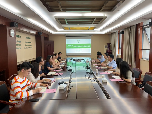 9月2日下午,南京理工大学红足1世77814党委副书记游鹏、学工办主任孔小敏、团委书记虞春燕、各年级辅导员一行来红足1世官网交流座谈。学院党委副书记涂志宏、团委书记刘小杨与各年级辅导员陪同座谈。