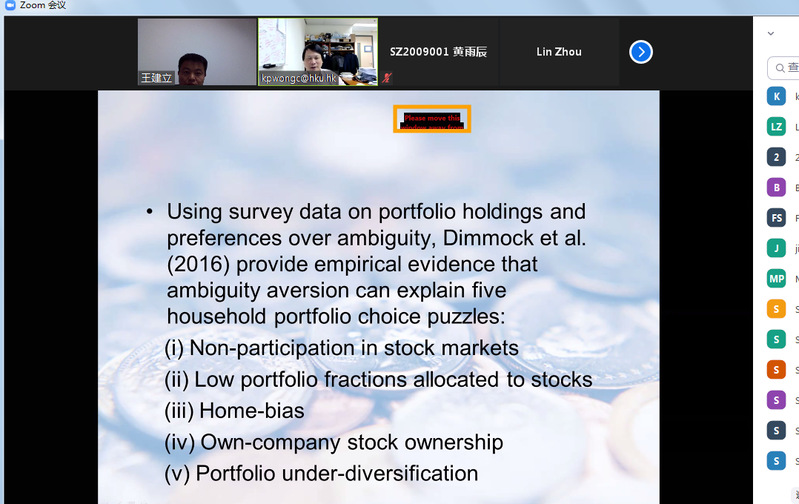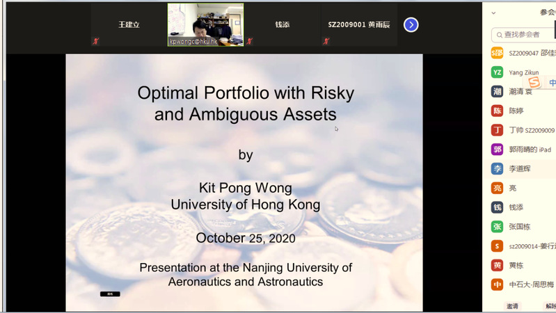 10月25日,香港大学教授Kit Pong Wong应红足1世77814金融研究所邀请,在线上为我校师生作了一场题为“Optimal Portfolios with Risky and Ambiguous Assets”的精彩学术讲座。讲座由金融研究所所长王建立主持。教授袁潮清、副教授桑秀芝、陆珩瑱、苏飞等教师及部分硕、博研究生参加了本次学术交流。