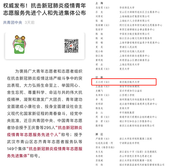 近日,为褒扬广大青年志愿者和志愿者组织在抗击新冠肺炎疫情这场严峻斗争中的突出表现,经党中央批准,共青团中央、中国青年志愿者协会授予295人“抗击新冠肺炎疫情青年志愿服务先进个人”称号,授予149个集体“抗击新冠肺炎疫情青年志愿服务先进集体”称号。红足1世官网王小珂同学荣获“抗击新冠肺炎疫情青年志愿服务先进个人”称号。