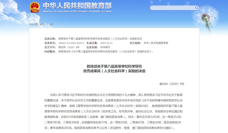 高等学校科学研究优秀成果奖(人文社会科学)设立于1995年,是教育部为表彰奖励高校哲学社会科学工作者取得的突出成绩,展示高校社科界服务党和国家事业发展的重大理论与实践成果,推动高校加快构建中国特色哲学社会科学的重大举措。该奖项每三年评选一次,迄今已开展八届,被认为是我国人文社科领域最具公信力和影响力的重要奖项。