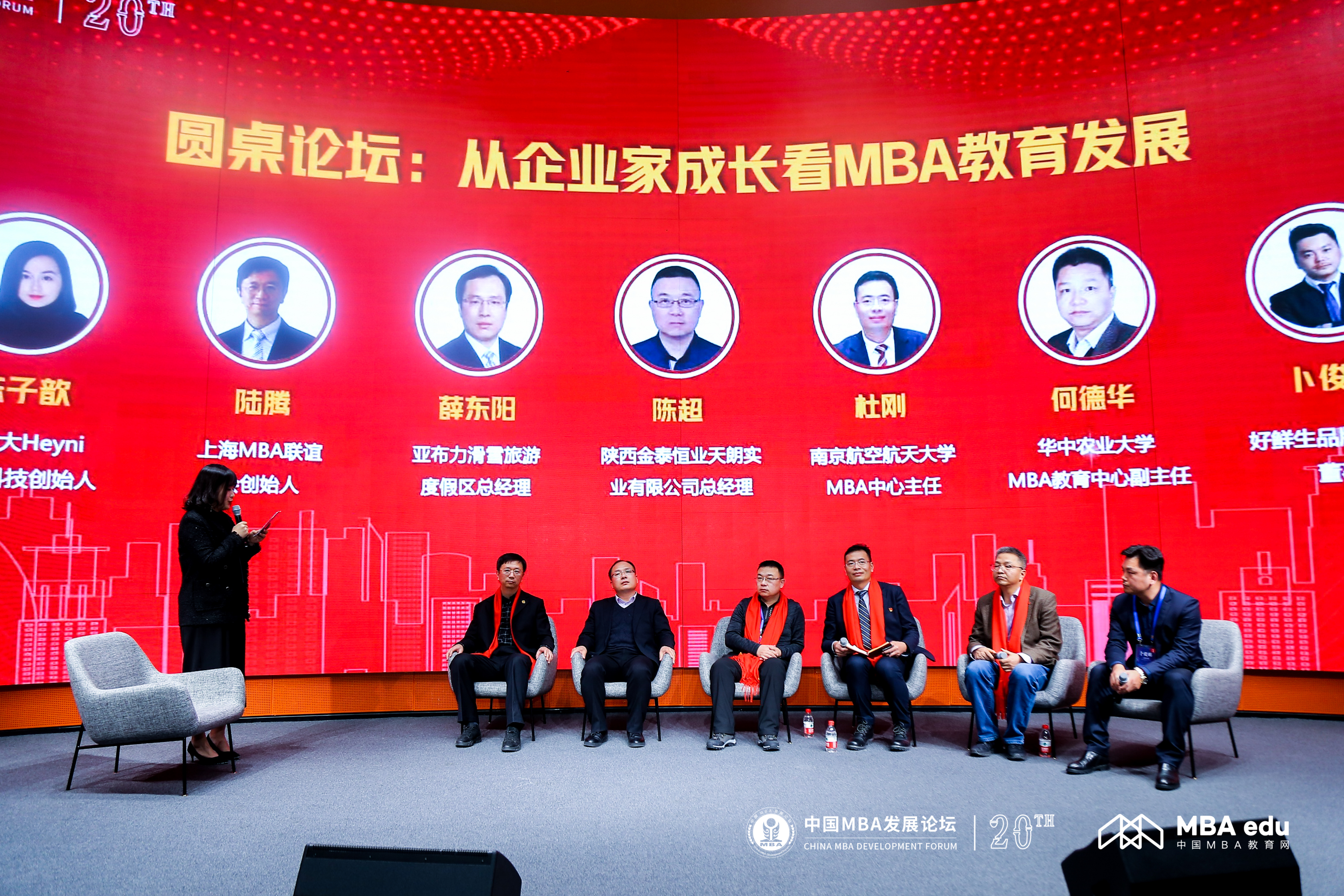 南京航空航天大学MBA中心执行主任杜刚,上海MBA联谊会创始人陆腾,亚布力阳光度假村总经理薛东阳,陕西金泰恒业天朗实业有限公司总经理陈超,华中农业大学MBA教育中心副主任何德华,好鲜生品牌创始人、董事长卜俊鹏围绕“从企业家成长看MBA教育发展”主题进行圆桌分享。MBA共享部落温哥华分站站长、加拿大Heyni中文科技创始人陈子歆主持论坛。
