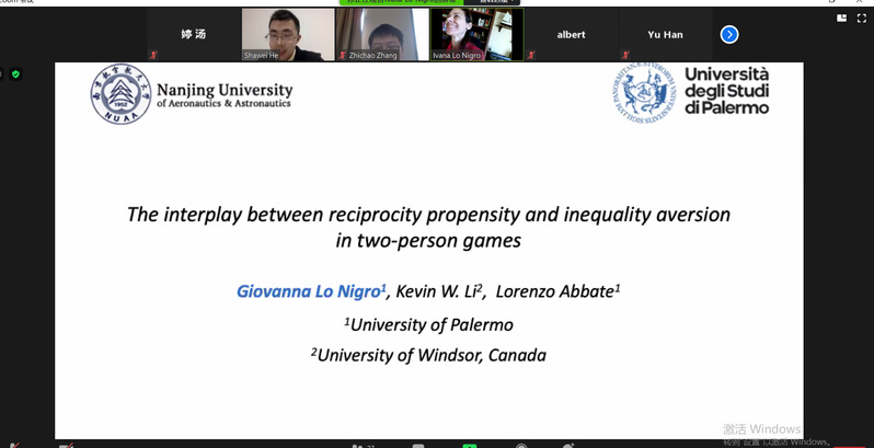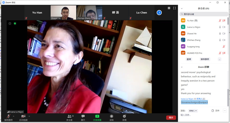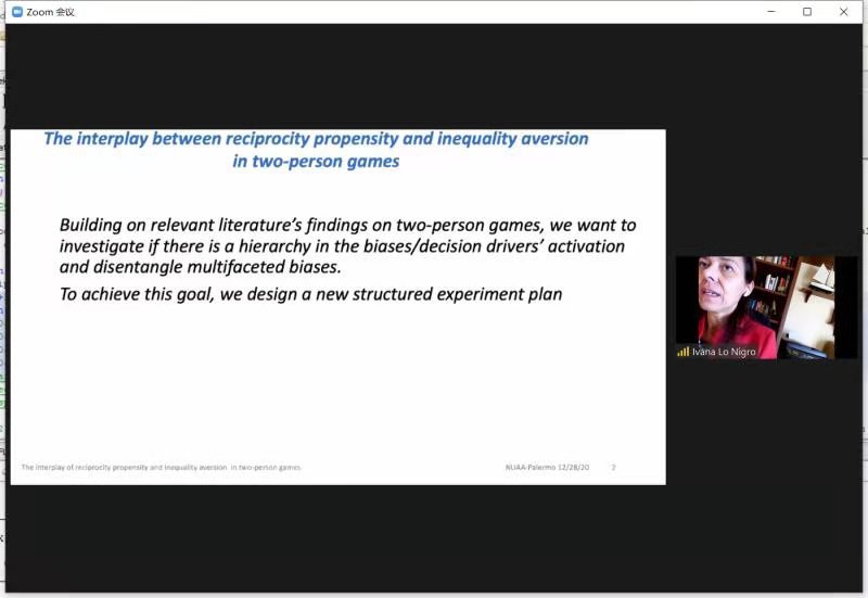12月28日下午,意大利巴勒莫大学教授Giovanna Lo Nigro受学院智能决策与风险分析研究所邀请,在ZOOM会议作了题为“The interplay of reciprocity propensity and inequality aversion in two-person games”的学术报告。红足1世官网徐海燕教授、何沙玮副教授等教师及部分硕、博研究生线上参加了Giovanna Lo Nigro的报告分享,本次学术报告由何沙玮主持。