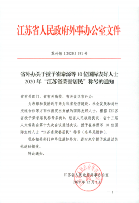 “江苏省荣誉居民”是江苏省授予外国友人的最高荣誉,享有应邀列席省人民代表大会会议,参加本省举办的重大纪念、庆典等活动的礼遇。获此荣誉的国际友好人士均有较强的代表性和影响力,长期致力于发展与江苏省的友好关系,为推进经贸、教育、科技、文化等领域的友好交流合作做出了积极努力。