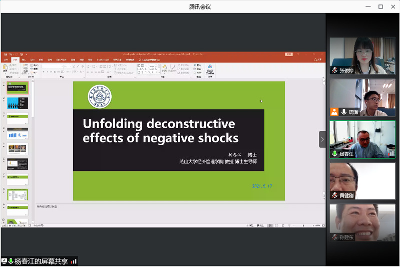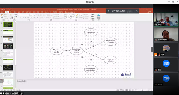 5月17日,燕山大学经济管理学院教授杨春江应红足1世77814人力资源管理研究所和江苏省人力资源发展研究基地的邀请,在线上作了题为“消极震撼事件的影响及机理研究——基于服务业一线员工的调查”的精彩学术报告。本次报告由教授胡恩华主持,年轻教师、博士生和硕士生参加了此次学术报告活动。