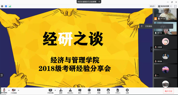 为更好的帮助考研同学做好备考规划和报考指导,8月29日晚上,经管学院开展经“研”之谈主题考研经验交流会,辅导员许乃元、胡心雨以及2018级全体备战考研同学参加了本次活动。