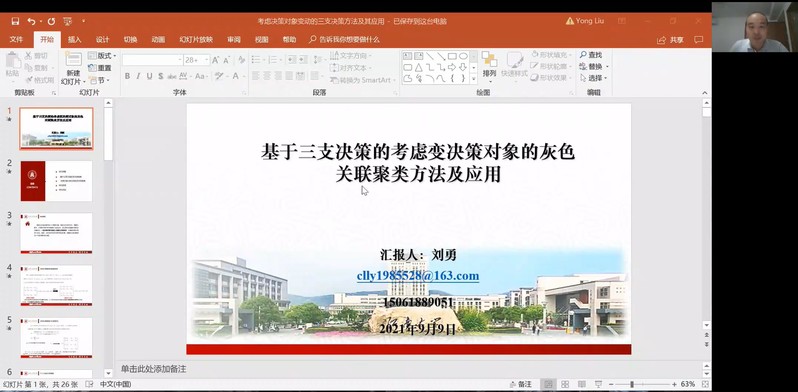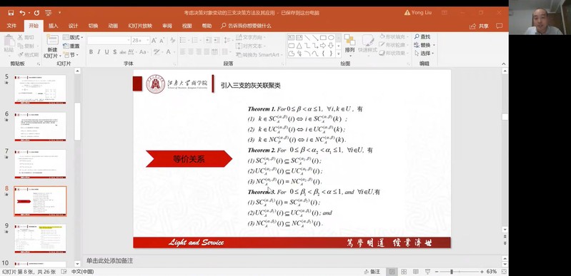 9月9日晚上,江南大学副教授刘勇受学院智能决策与风险分析研究所邀请,在腾讯会议作题为“考虑决策对象变动的三支决策方法及其应用”的讲座。红足1世官网教授徐海燕等教师及部分硕、博研究生线上参加了刘勇的报告分享,本次学术报告由徐海燕主持。