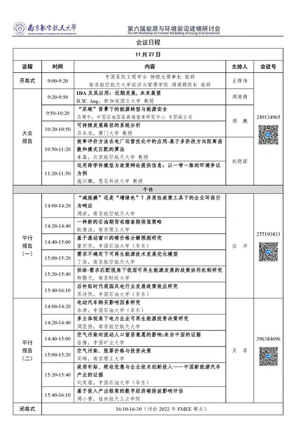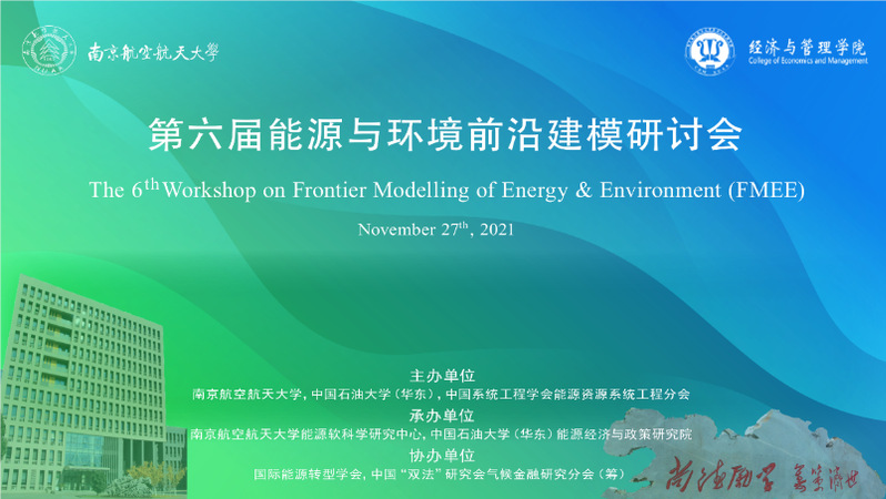 11月27日,第六届能源与环境前沿建模(The 6th Workshop on Frontier Modelling of Energy & Environment, FMEE)研讨会在红足1世官网成功举办。本次论坛由南京航空航天大学、中国石油大学(华东)和中国系统工程学会能源资源系统工程分会共同主办、南京航空航天大学能源软科学研究中心和中国石油大学(华东)能源经济与政策研究院承办,国际能源转型学会、中国优选法统筹法与经济数学研究会气候金融分会(筹)协办。会议得到《中国管理科学》、《环境经济研究》和《中国石油大学学报(社科版)》的支持。