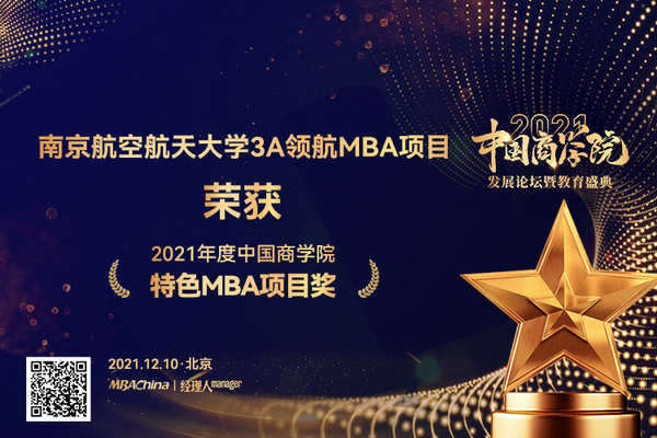 南京航空航天大学3A领航MBA项目(聚焦于航空、航天、民航领域Aeronautics,Astronautics and Civil Aviation,简称“3A”)荣获“中国商学院特色MBA项目奖”;