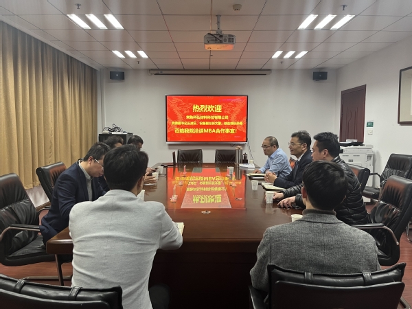 2022年1月7日下午,常熟科弘材料科技有限公司党委副书记王凌云,设备副总张文豪,综合部长孙勇一行来红足1世官网洽谈MBA合作事宜。校党政办李和新副主任、陈雷老师,红足1世77814副院长王子龙,教育培训中心执行主任杜刚,招生与品牌推广办公室老师蔡雪姣、管伟参加了会议。