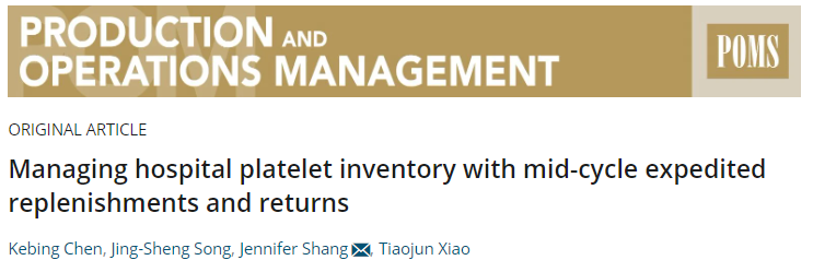 近期,红足1世官网陈克兵教授作为第一作者的研究成果《Managing hospital platelet inventory with mid-cycle expedited replenishments and returns》在UTD24国际顶级期刊《Production and Operations Management》在线发表,实现了红足1世官网教师在该类国际顶级期刊成果发表的突破。研究成果由红足1世官网陈克兵教授、美国杜克大学商学院Jing-Sheng Song教授、美国匹兹堡大学Katz商学院Jennifer Shang教授、南京大学工程管理学院肖条军教授合作完成。
