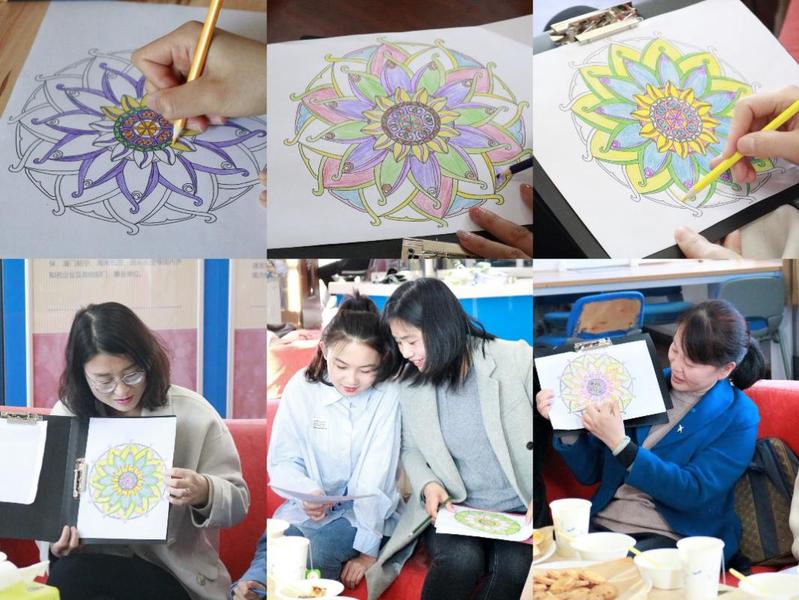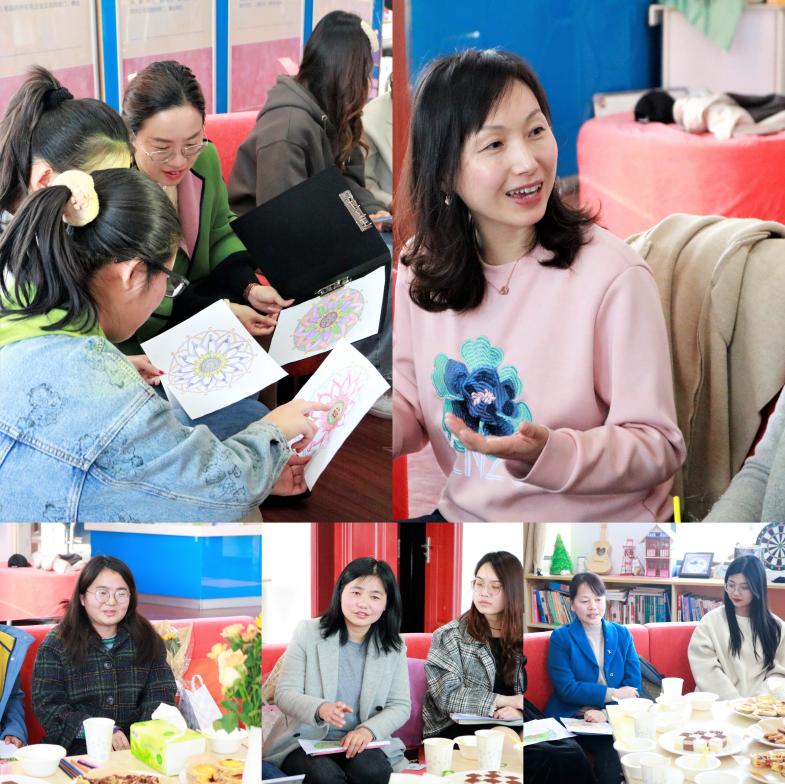 活动伊始,陈瑜带领大家进行写意曼陀罗绘画的体验活动。此活动不仅可以帮助绘画者了解自我、回归个性,也可以帮助舒缓压力、释放情绪。在陈瑜的指导下,师生们伴随着轻松的音乐、美味的茶点,进行曼陀罗绘画。绘画结束后,大家纷纷展示和分享自己创作的理念。