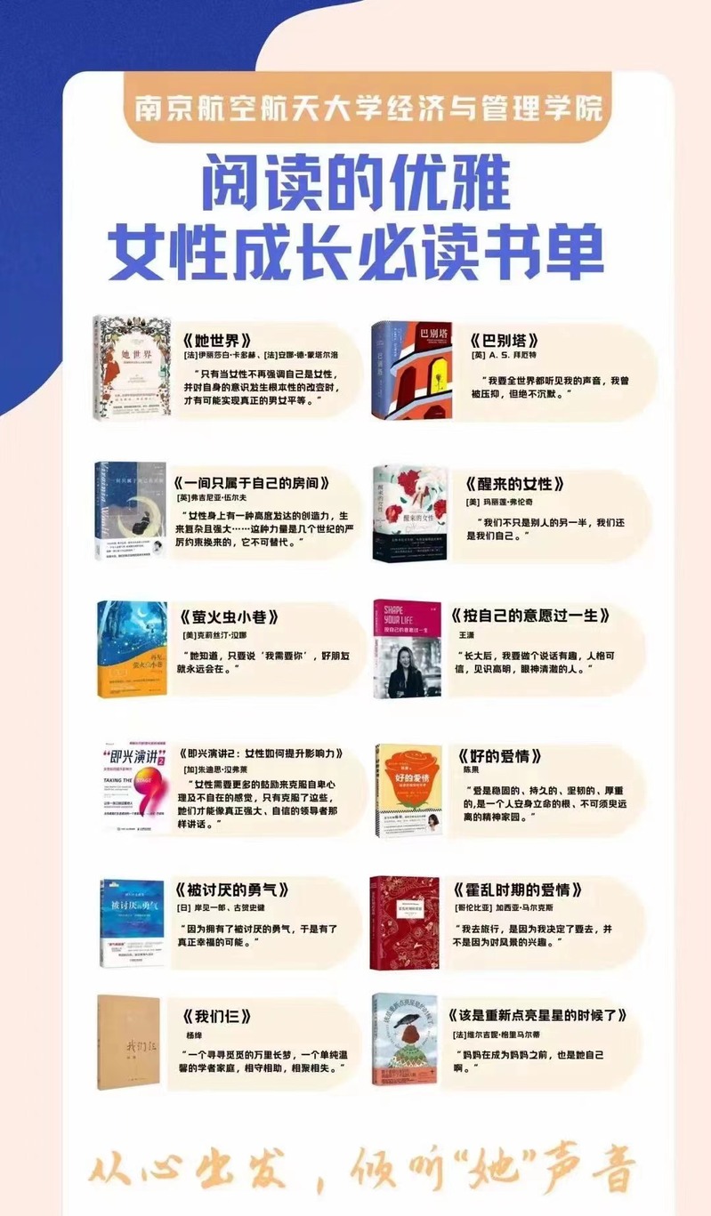 除了此次师生分享活动,学院“经心周课堂“也推出系列推送《了不起的她力量》,列出女性成长必读书单。鼓励大家关注女性成长,释放多样女性力量。