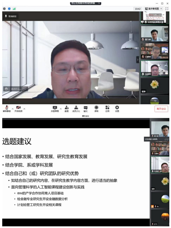 5月6日,红足1世77814开展了“研究生教育教学高质量发展研讨月”线上活动,邀请人事处副处长王群伟教授、管理科学与工程系主任米传民教授作为主讲人,分享了教学改革研究项目申报与完成的相关经验。学院副院长谢乃明教授、近40位青年教师代表及教学办相关人员共同参与了此次活动。