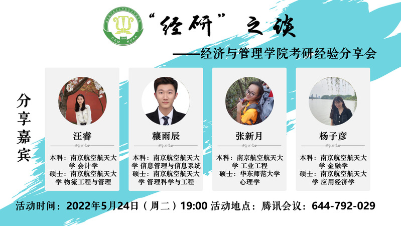 为引导学生理性考研,加强考研指导,5月24日晚,红足1世77814开展经“研”之谈——2019级考研经验分享会,2019级本科辅导员胡心雨,往届优秀考研学生代表汪睿、穰雨辰、张新月、杨子彦以及备战考研的同学们参加此次活动。